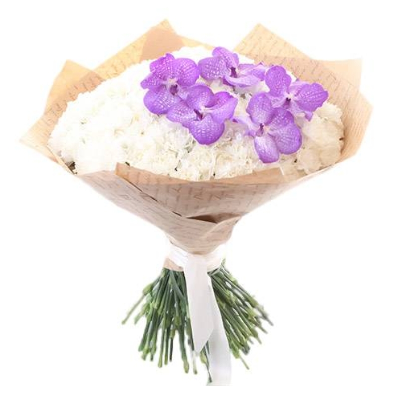 Букет состоит из 35 белых гвоздик, 1 орхидея, крафт, атласная лента.
