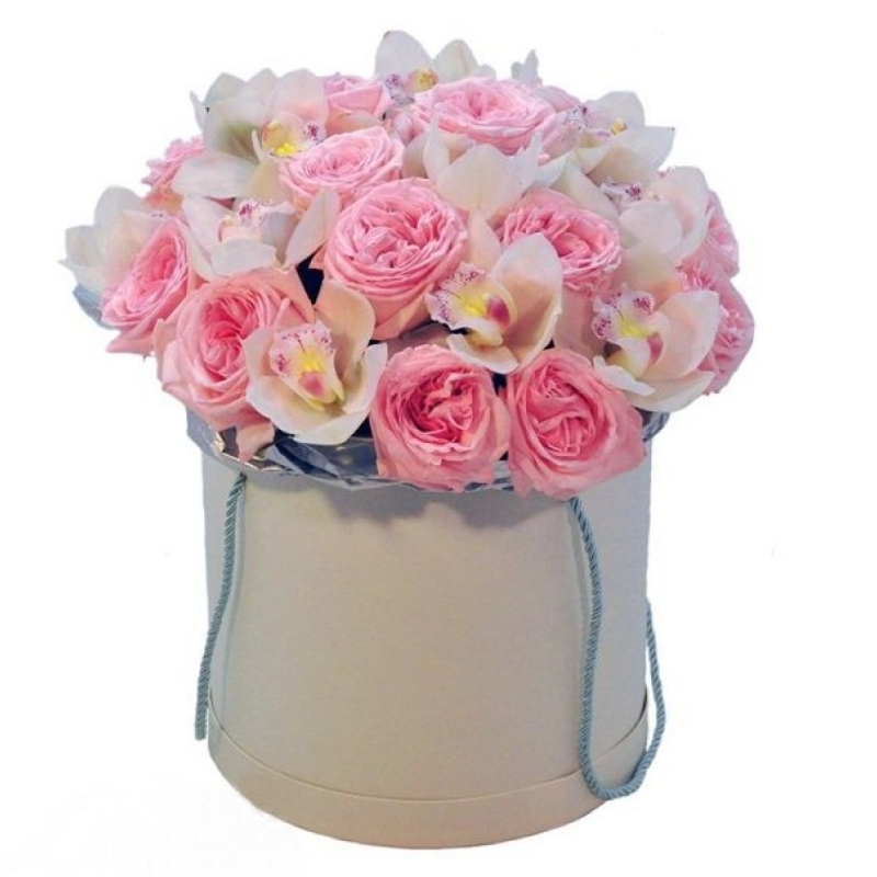 Букет из пионовидных роз и орхидей в коробке