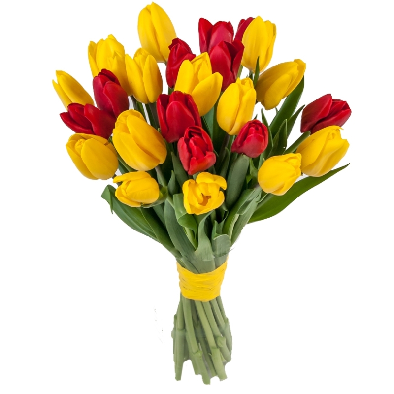 Букет состоит из 11 желтых тюльпанов, 10 красных тюльпанов, прозрачная упаковка, атласная лента.